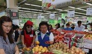 가뭄 폭염 피해 농가를 돕기 위한 농산물 판매 행사가 6일 서울 서초구 농협 하나로마트 양재점에서 열렸다. 5일 시작한 이 행사는 물량이 소진될 때까지 진행된다. 김병문 농협유통 대표(왼쪽에서 세 번째)가 유니폼을 입고 고객들에게 직접 복숭아와 자두를 선보이고 있다. 안철민 기자 acm08@donga.com}