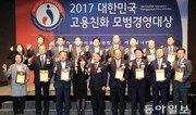 동아일보가 주최하고 과학기술정보통신부, 산업통상자원부, 고용노동부, 여성가족부, 중소벤처기업부가 후원하는 ‘2017 대한민국 고용친화 모범경영대상’ 시상식이 28일 서울 중구 더플라자호텔에서 열렸다. 롯데첨단소재, 국민건강보험공단, 부산시 등 기업과 기관, 지방자치단체 17곳이 수상의 영예를 안았다. 수상자와 행사 관계자들이 기념촬영을 하고 있다. 안철민 기자 acm08@donga.com}