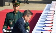 문재인 대통령이 1일 경기 성남시 서울공항에서 열린 6·25전쟁 국군 전사자 유해 64위의 봉환 행사에서 유해가 담긴 관 위에 일일이 6·25 참전 기장을 수여하고 있다. 기장은 훈·포장과 달리 특정한 사건과 업적, 날 등을 기념해 수여하는 ‘기념장(紀念章)’이다. 대통령이 유해 봉환 행사에 참석한 것은 6년 만으로, 모든 유해에 각각 기장을 수여한 것은 처음이다. 성남=원대연 기자 yeon72@donga.com}