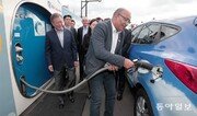 프랑스를 국빈 방문 중인 문재인 대통령(왼쪽)이 14일(현지 시간) 파리 시내 알마 광장에서 현지 택시 운전사가 현대자동차가 수출한 투싼 수소전기차 택시를 충전하는 것을 지켜보고 있다. 문 대통령은 이날 현대자동차의 또 다른 수소전기차 넥쏘에 탑승해 파리 도심을 주행했다. 파리=원대연 기자 yeon72@donga.com}