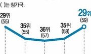 올해 한국의 교육경쟁력은 29위로 지난해보다 6단계 올랐다. 2007년(29위)을 빼고는 2001년부터 줄곧 30위권 밖을 맴돌다가 20위권에 처음 들어갔다. 교육과학기술부는 27일 스위스 국제경영개발연구원(IMD)이 발간한 ‘2011년도 국가경쟁력보고서’에서 교육 부문 분석 결과를 발표했다. 조사 대상 59개국 가운데 1위는 덴마크, 2위 아일랜드, 3위는 핀란드 등 유럽 국가가 10위권에 7개국이었다. 한국은 29위로 아시아에서는 싱가포르(10위) 대만(25위) 홍콩(28위) 다음이었다. 일본은 34위, 중국은 43위였다. 지난해 58개국 가운데 35위였던 한국의 순위가 올라간 이유는 교육제도 대학교육 경영교육 언어능력 과학교육 부문이 개선됐기 때문. 특히 교육이 인력 양성에 기여하는지를 기업인에게 묻는 교육제도나 과학교육 부문은 지난해보다 각각 11단계, 12단계씩 상승했다. 양적인 부문의 순위는 지난해와 크게 달라지지 않았다. 국내총생산(GDP) 대비 교육관련 공공지출(33위)과 중등학교 취학률 항목(6위)이 2, 3단계 오르는 데 그쳤다. 초중학교 교사 1인당 학생 수, 영어 숙달도(토플 성적)는 여전히 50위권 안팎으로 최하위였다. 교과부는 “지난해보다 경쟁력이 상승했지만 교육 여건을 개선할 여지가 많다. 산학협력을 강화해 사회 수요에 맞는 인재를 육성하겠다”고 밝혔다.최예나 기자 yena@donga.com}