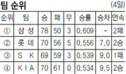 “머리 아파 죽겠어요.” SK 이만수 감독대행은 최근 ‘희망 고문’이란 단어를 체감하고 있다. 플레이오프 직행 희망의 끈을 놓기도, 2위 탈환을 위해 총력전을 펴기도 어려운 사정 때문이다. 전날까지 3위인 SK는 2위 롯데에 1경기 차로 뒤졌고 4위 KIA에는 1.5경기 차로 앞섰다. KIA와의 시즌 마지막 3연전 결과에 따라 2위 등극까지 노릴 수 있는 상황이었다. 하지만 무리하게 총력전을 펴다가 KIA에 패하면 8일 시작하는 준플레이오프 준비까지 망칠 소지가 있었다. 이 감독대행은 “투수 로테이션 시나리오를 4개나 만들었지만 정답이 보이지 않는다. 김상진 코치와 밤샘 회의를 하느라 잠도 몇 시간 못 잘 정도”라고 고충을 털어놨다. 4일 프로야구 세 경기 결과 이 감독대행의 플레이오프 직행의 꿈은 무너졌다. 3위 SK는 KIA에 0-4로 패한 반면 2위 롯데는 한화에 20-2로 대승을 거뒀기 때문이다. 롯데는 SK에 2경기 차로 앞서 남은 두 경기 결과에 상관없이 플레이오프 직행을 확정지었다. 반면 SK는 4위 KIA에 0.5경기 차로 쫓기며 남은 두 경기 결과에 따라 3위마저 장담할 수 없는 처지가 됐다. 이날 SK는 이 감독대행의 복잡한 속내를 반영하듯 답답한 경기를 펼쳤다. 선발 고효준은 3이닝 동안 5안타 3볼넷을 허용하며 3실점했다. 타선도 무기력했다. 산발 3안타에 그치며 한 점도 뽑아내지 못했다. 반면 일찌감치 준플레이오프행이 결정된 KIA는 여유가 넘쳤다. 조범현 KIA 감독이 포스트시즌 선발로 준비 중인 한기주는 지난달 29일에 이어 선발 등판해 최고 시속 152km에 이르는 강속구를 던졌다. 손가락에 물집이 잡혀 2이닝 만에 마운드를 내려갔지만 6타자를 상대로 1안타만 허용하며 무실점 호투를 펼쳤다. 이후 손영민 서재응 임준혁 김희걸 심동섭에 이어 마무리 김진우가 마운드에 올라 무실점 투구로 준플레이오프 예행연습을 성공적으로 마쳤다. 사직에서 롯데는 올 시즌 한 팀 최다인 20득점을 올리며 창단 후 첫 플레이오프 직행을 자축했다. 롯데는 김주찬의 연타석 홈런 등 선발 전원 안타에 장단 22안타를 몰아쳐 한화에 20-2로 이겼다. 특히 6회에만 11점을 집중시키는 파괴력을 선보였다. 7위 LG는 선두 삼성을 7-2로 이기고 6위 두산에 0.5경기 차로 다가섰다. 광주=유근형 기자 noel@donga.com}
