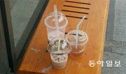12일 오후 5시경 서울 강남역 인근의 한 마을버스 정류장. 성인 셋은 충분히 앉을 법한 정류장 벤치에는 누군가 버리고 간 테이크아웃용 커피 컵 세 개가 놓여져 있었다. 벤치 한쪽에 나란히 컵이 놓인 모양새가 마치 근처에 즐비한 카페 테이블을 연상케 했다. 각기 다른 사람이 버리고 간 듯 각기 다른 매장의 용기였다. 마을버스를 타러 온 한 남학생 무리는 벤치에 버려진 일회용 컵을 보고는 두 명만 앉아 이야기를 나눴다. 커피가 그대로 남아있는 것은 물론이고 군데군데 휘핑크림이 묻은 컵을 그 누구도 치울 생각을 하지 못했다. 커피 프랜차이즈, 테이크아웃 커피 전문점 등이 급증하면서 이들 매장이 사용하는 일회용 종이컵이 골칫거리가 되고 있다. 커피 구매자가 버스를 타거나 담배를 피울 때처럼 두 손이 필요한 상황이 닥치면 아무 곳에나 종이컵을 버리는 탓에 도로나 버스정류장 이용에 큰 불편을 끼치고 있다. 경범죄처벌법에 따르면 쓰레기 무단투기는 10만 원 이하의 벌금, 구류 또는 과료의 형으로 처벌받는다. 이날 기자가 지하철 2호선 강남역 10번 출구에서 9호선 신논현역 6번 출구까지 600여 m를 10여 분간 걸으며 대로변에서 찾은 버려진 커피용 종이컵은 총 13개. 버스 정류장 벤치는 물론이고 옷 가게 쇼윈도 앞, 버스정류장 안내판 밑, 아스팔트 도로 위 등 다양한 곳에서 나왔다. 이 밖에도 홍대입구, 여의도 등 커피전문점이 몰려 있는 곳이라면 어디든 버려진 일회용 종이컵을 찾을 수 있었다. 문제는 여느 쓰레기와 달리 버려진 일회용 컵 중 대다수는 안에 커피, 주스 등 내용물이 일부 남아 있다는 점이다. 대부분 당분이 함유돼 조금만 흘려도 끈적끈적해지는 데다 얼룩이 남아 누군가 손으로 치우기도 힘들고 내용물이 흘러나온 줄 모르고 벤치에라도 앉으면 낭패를 당하기 일쑤다. 강남역 인근을 청소하는 환경미화원은 본격적인 낙엽철이 다가오기 전까지 수시로 역 인근에서 물청소를 해야 했다. 휴지통 찾기 어려운 점도 문제다. 11년째 강남역 인근에서 일하는 환경미화원 김영민 씨(44)는 “찬 음료를 담는 플라스틱 일회용 컵은 일반 페트병과 소재가 달라 별도로 분리작업을 해야 한다”며 “환경을 생각해 개인용 컵을 사용하든가 아니면 반드시 쓰레기통에 버리는 성숙한 시민의식을 보여줬으면 좋겠다”고 말했다. 강홍구 기자 windup@donga.com}