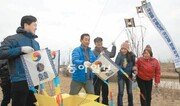 영산강 살리기 사업 완공을 기념해 광주 민속연보존회와 익산지방국토관리청이 4일 광주 남구 승촌동 영산강 승촌보에서 전국 한마음 연날리기 대회를 열었다. 전남 영광군 법성포민속연보존회 회원들이 200여 개의 연을 이어 만든 줄연을 날리고 있다. 박영철 기자 skyblue@donga.com}