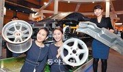 한국산업기술평가관리원은 지식경제부, 한국산업기술진흥원과 공동으로 미래 첨단 소재를 미리 체험할 수 있는 ‘소재부품 미래비전 2020’ 전시회를 1일 서울 강남구 삼성동 코엑스에서 열었다. 이날 전시회에서 홍보 도우미들이 여성들도 쉽게 들 수 있을 정도로 가벼운 초경량 마그네슘 휠을 선보였다. 장승윤 기자 tomato99@donga.com}