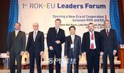 동아시아재단이 주관한 ‘제1회 한-유럽연합(EU) 리더스 포럼’이 3일 서울 중구 소공동 롯데호텔에서 한국과 EU 의회 의원들이 참석한 가운데 열렸다. 포럼에서는 한-구주 의원외교협의회 회장인 민주당 이강래 의원(왼쪽에서 네 번째)과 EU 의회 한반도관계 대표단의 대표인 크리스티안 엘러 의원(왼쪽에서 세 번째)을 주축으로 한-EU 협력의 기본 방향과 세부 협력방안 등을 논의했다. 동아시아재단 제공}