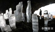 강추위가 만들어 낸 작품들이 동굴에서 조용히 전시회를 하고 있네요. 크기, 모양도 가지각색. 동굴 천장에서 떨어지는 낙수 한 방울 한 방울로 불쑥불쑥 커지는 역고드름들이 어느 전시회 작품 못지않습니다. 입장료는 무료입니다. ―충북 제천 보덕암에서전영한 기자 scoopjyh@donga.com}