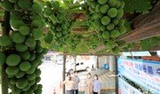 13일 광주 북구 중흥2동 주민센터 앞 쉼터에서 가지마다 주렁주렁 매달린 청포도를 주민들이 살펴보고 있다. 박영철 기자 skyblue@donga.com}