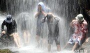 장마가 잠시 주춤하고 폭염이 기승을 부리고 있는 11일 전남 구례군 산동면 지리산 수락폭포를 찾은 피서객들이 15m 높이에서 떨어지는 폭포수를 맞으며 무더위를 식히고 있다. 박영철 기자 skyblue@donga.com}