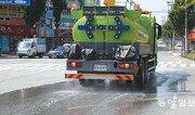연일 33도를 오르내리는 폭염이 계속 중인 11일 광주 북구 용봉동 전남대 인근 도로에서 북구 소속 대형 살수차가 한낮 도로의 열기를 식히기 위해 도로를 오가며 물을 뿌리고 있다.박영철 기자 skyblue@donga.com}