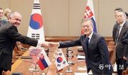 문재인 대통령이 안드레이 키스카 슬로바키아 대통령과 10일 청와대에서 정상회담을 하기에 앞서 악수하고 있다. 두 정상은 경제, 과학기술 및 연구개발(R&D) 협력 방안 등을 포함한 양국 관계 발전에 대해 의견을 교환했다. 원대연 기자 yeon72@donga.com}