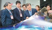 문재인 대통령이 20일 서울 강서구 마곡산업단지에서 열린 ‘LG사이언스파크’ 개장식에 참석해 종이처럼 휘어지는 대형 유기발광다이오드(OLED·올레드) 디스플레이를 살펴보고 있다. 문 대통령이 “세계적으로 개발된 기술이냐”고 묻자 구본준 LG그룹 부회장(왼쪽)은 “이 기술은 전 세계에서 LG밖에 없다”고 설명했다. 문 대통령은 “이 연구단지는 혁신성장의 미래”라며 “정부는 신기술을 가로막는 규제를 풀겠다”고 강조했다. 원대연 기자 yeon72@donga.com}