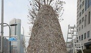 23일 서울 강남구 영동대로 KT&G 사옥 앞에서 산타 복장을 입은 환경단체 관계자가 담배꽁초로 만든 높이 5m, 직경 3m의 거대한 트리를 가리키고 있다. 서울환경운동연합은 담배꽁초가 해양 미세플라스틱 오염의 원인인 걸 알리기 위해 이제석 광고연구소와 함께 이날 담배꽁초트리를 만들어 2시간가량 전시했다. 김동주 기자 zoo@donga.com}