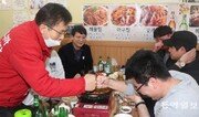 종로 출마를 선언한 자유한국당 황교안 대표가 16일 오후 서울 종로구 낙원시장의 한 아귀찜 가게를 방문해 식사 중인 시민과 주먹으로 손 인사를 하고 있다. 황 대표는 시민들에게 “힘들지만 열심히 하고 있다”며 “종로 살릴 사람이 누군지 선입견 없이 판단해 달라”고 했다. 김동주 기자 zoo@donga.com}