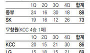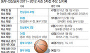 질식 수비로 유명한 동부가 ‘짠물 농구’의 진수를 펼쳤다. 한파가 몰아친 강원도에서 인삼공사의 공격력은 꽁꽁 얼어붙었다. 선두 동부는 11일 원주에서 열린 홈게임에서 2532명의 만원 관중이 몰린 가운데 2위 인삼공사에 역대 한 경기 최소 득점의 수모를 안기며 52-41로 이겼다. 신기록을 쏟아낸 승리였다. 동부는 역대 최소인 37경기 만이자 역대 최단인 89일 만에 정규시즌 30승(7패) 고지에 올랐다. 4연승을 달린 동부는 인삼공사와의 승차를 4경기로 벌리며 독주를 예고했다. 양팀 합산 점수 93점, 후반 합산 점수 34점, 인삼공사의 3쿼터 3점과 3쿼터까지 점수 28점 등도 모두 역대 최소 기록이다. 지난 인삼공사와의 4차전에서 53점만 허용했던 동부 강동희 감독은 “오늘도 그랬으면 좋겠다”고 말했지만 한 술 더 뜬 셈이 됐다. 동부가 4쿼터 막판 주전을 빼지 않았다면 실점을 30점대로 막을 수도 있었다. 저실점 비결에 대해 강 감독은 “상대 스피드에 맞서 오히려 지공을 준비했다. 압박 수비에 따른 실책을 줄이려고 공격 코트로 넘어갈 때 가드 한 명이 안전하게 공격을 이끌도록 지시했다”고 밝혔다. 인삼공사의 2 대 2 플레이도 철저하게 차단했다. 강 감독은 “정규시즌 우승을 향한 중요한 일전이었다. 선수들이 그 의미를 잘 알고 플레이했다. 최소 득점 기록은 언젠가 깨지지 않겠느냐”고 말했다. 동부는 벤슨이 23득점, 22리바운드의 괴력을 과시했고 윤호영(11득점)도 득점에 가세했다. 동부 김주성은 수비와 경기 조율에 치중하면서 6득점, 4리바운드, 3어시스트를 기록했다. 황진원을 대신한 동부 식스맨 진경석은 수비에서 인삼공사 외곽 선수들을 틀어막았다. 설상가상으로 인삼공사 선수들의 발은 무겁기만 했다. 화이트가 17점을 넣었을 뿐 나머지 국내 선수 중에는 오세근의 7점이 최고였다. 고양에서는 ‘고춧가루 부대’가 된 9위 오리온스가 플레이오프 진출을 향해 1승이 절박한 LG를 92-76으로 눌렀다. 공동 7위였던 LG는 8위로 밀려나며 6위 모비스와의 승차가 2.5경기로 벌어졌다.원주=김종석 기자 kjs0123@donga.com}