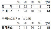 동부 강동희 감독은 올 시즌 ‘질식 수비’를 앞세워 선두를 질주하고 있다. 그런 강 감독이 “숨도 제대로 못 쉴 상대”라고 어려움을 털어놓았다. 1일 인삼공사와의 안양 방문경기를 앞둔 때였다. 앞서 치른 인삼공사와의 3차례 맞대결에서 동부가 2승 1패로 앞섰어도 3경기 모두 두 팀은 60점대에 머물며 평균 점수 차는 3.3점에 불과했다. 이날 패할 경우 동부는 2위 인삼공사에 0.5경기 차로 바짝 쫓기게 됐기에 좌불안석이었다. 강 감독은 “젊음과 개인기를 겸비한 인삼공사는 위협적”이라고 말했다. 강 감독의 염려대로 동부는 5779명의 만원 관중이 들어찬 경기장에서 3쿼터까지 숨이 턱턱 막힌 끝에 40-43까지 뒤졌다. 4쿼터 들어 강 감독은 비로소 숨통을 텄다. 결정적인 외곽슛 2개가 산소호흡기 역할을 했다. 동부는 1점 앞선 경기 종료 3분 49초 전 안재욱의 3점슛으로 달아나기 시작했다. 두 번째는 김주성의 손끝에서 나왔다. 김주성은 6점 앞선 종료 1분 10초 전 코트 정면에서 4m짜리 점프슛을 꽂아 승부에 쐐기를 박았다. 4쿼터에 20점을 집중시키며 인삼공사를 10점으로 묶은 동부가 60-53으로 이겼다. 김주성은 40분을 모두 뛰며 10득점, 8리바운드를 기록했다. 동부 벤슨은 22득점, 13리바운드로 맹활약했다. 인삼공사 신인 오세근은 12득점, 13리바운드로 버텼다. 잠실에서 SK는 삼성을 89-75로 눌렀다. 삼성은 올 시즌 안방에서 전패에 허덕이며 역대 안방경기 최다 타이인 13연패의 수모까지 안았다. SK 신인 김선형은 3쿼터 종료 직전 역대 두 번째로 긴 23m짜리 버저비터를 성공시키는 묘기를 선보였다. 역대 1위는 조동현이 2001년 세운 25m. 안양=김종석 기자 kjs0123@donga.com▲}