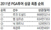 마치 디즈니랜드의 마법쇼 같은 짜릿한 뒤집기 드라마였다. 시상식에서 도널드 덕 캐릭터 인형과 나란히 선 세계 남자 골프 랭킹 1위 루크 도널드(34·잉글랜드)는 구름 위를 나는 듯 황홀한 표정이었다. 24일 미국 플로리다 주 레이크부에나비스타의 디즈니골프장(파72)에서 끝난 미국프로골프(PGA)투어 칠드런스 미러클 네트워크 호스피털스 클래식. 시즌 최종전인 이 대회는 환희와 탄식이 엇갈리며 화려한 피날레를 장식했다.○ 기적의 사나이상금 랭킹 2위로 떨어졌던 도널드는 이 대회에서 우승이나 준우승을 차지하고 상금 선두 웹 심프슨(미국)의 성적을 따져봐야 상금왕에 오를 수 있었다. 전날까지 선두에게 5타 뒤진 공동 14위였던 도널드는 이날 전반까지 2타를 줄이는 데 그쳐 희망이 없어 보였다. 하지만 10∼15번홀에서 6연속 버디를 낚는 집중력을 보였다. 퍼트 수를 26개까지 떨어뜨리며 8타를 줄인 그는 합계 17언더파로 우승 트로피를 안았다. 우승 상금 84만6000달러를 받아 올 시즌 668만3214달러를 기록해 심프슨(634만7353달러)을 제치고 첫 상금왕에 등극했다.도널드는 유럽투어에서도 385만 유로를 획득해 2위 로리 매킬로이(254만 유로)에게 크게 앞서 있다. 6개 대회가 남아 있기는 해도 격차가 커 사상 첫 미국과 유럽투어 상금왕 석권을 예약했다. 평균 타수 1위(68.86타)로 바든트로피를 확보했고 동료들이 뽑는 PGA투어 올해의 선수상도 유력해졌다. 도널드의 평균 드라이버 비거리는 284.1야드로 147위에 불과하지만 정교한 쇼트게임으로 장타자를 압도했다.○ 불운의 연속심프슨은 상금왕을 향한 의욕을 보이며 톱스타들이 좀처럼 출전하지 않는 가을시리즈에 2주 연속 나섰다. 지난주 대회 준우승으로 도널드를 밀어내고 상금 선두에 나섰다. 훨씬 유리한 처지였던 심프슨은 같은 조인 도널드의 매서운 뒷심에 막혔다. 공동 6위로 마감한 심프슨은 도널드에게 축하 박수를 보내며 쓴입을 다셨다. 심프슨은 1000만 달러의 보너스가 걸린 페덱스컵 플레이오프에서도 3차전을 1위로 마쳤으나 최종 투어챔피언십에서 22위로 부진하며 페덱스컵 포인트 2위에 머물렀다. 1000만 달러는 페덱스컵 포인트 25위였다 투어 챔피언십에서 우승한 빌 하스(미국)에게 돌아갔다.○ 기사회생강성훈은 지난주까지 상금 랭킹 141위였다. 125위 안에 들어야 내년 출전권을 유지할 수 있었다. 실패하면 6라운드를 치르는 지옥의 레이스 퀄리파잉스쿨을 거쳐야 한다. 생존을 위해 이번 대회 3위 이내의 성적이 절박했다. 전날 공동 9위였던 강성훈은 18번홀에서 2.5m 버디 퍼트를 넣으며 공동 3위(14언더파)로 마감해 상금 순위를 120위로 끌어올렸다. 강성훈은 “마음을 비웠더니 오히려 잘됐다. 살아남아 날아갈 것 같다. 내일부터 뭘 해야 할지 모르겠다”며 웃었다.지난주 상금 랭킹 144위였던 저스틴 레너드(미국)는 이번 대회 2위에 힘입어 랭킹을 91위까지 끌어올려 출전권을 지켰다. 반면 공동 3위였던 김비오는 4타를 잃고 공동 20위까지 밀려나 상금 순위 162위로 시즌을 마쳤다. 150위 안에 들었다면 조건부 시드라도 받아 내년에 15개 대회 출전을 보장받을 수 있었기에 아쉬움이 더 컸다.김종석 기자 kjs0123@donga.com}