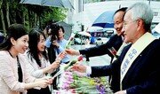 전국경제인연합회(전경련)와 농협중앙회는 31일 서울 덕수궁 대한문 앞에서 동일본 대지진에 따른 수출 감소로 어려움을 겪고 있는 국내 화훼농가를 돕기 위한 캠페인을 펼쳤다. 정병철 전경련 상근부회장(오른쪽)과 이덕수 농협중앙회 대표이사(오른쪽에서 두 번째)가 시민들에게 장미꽃을 나눠주고 있다.전영한 기자 scoopjyh@donga.com}