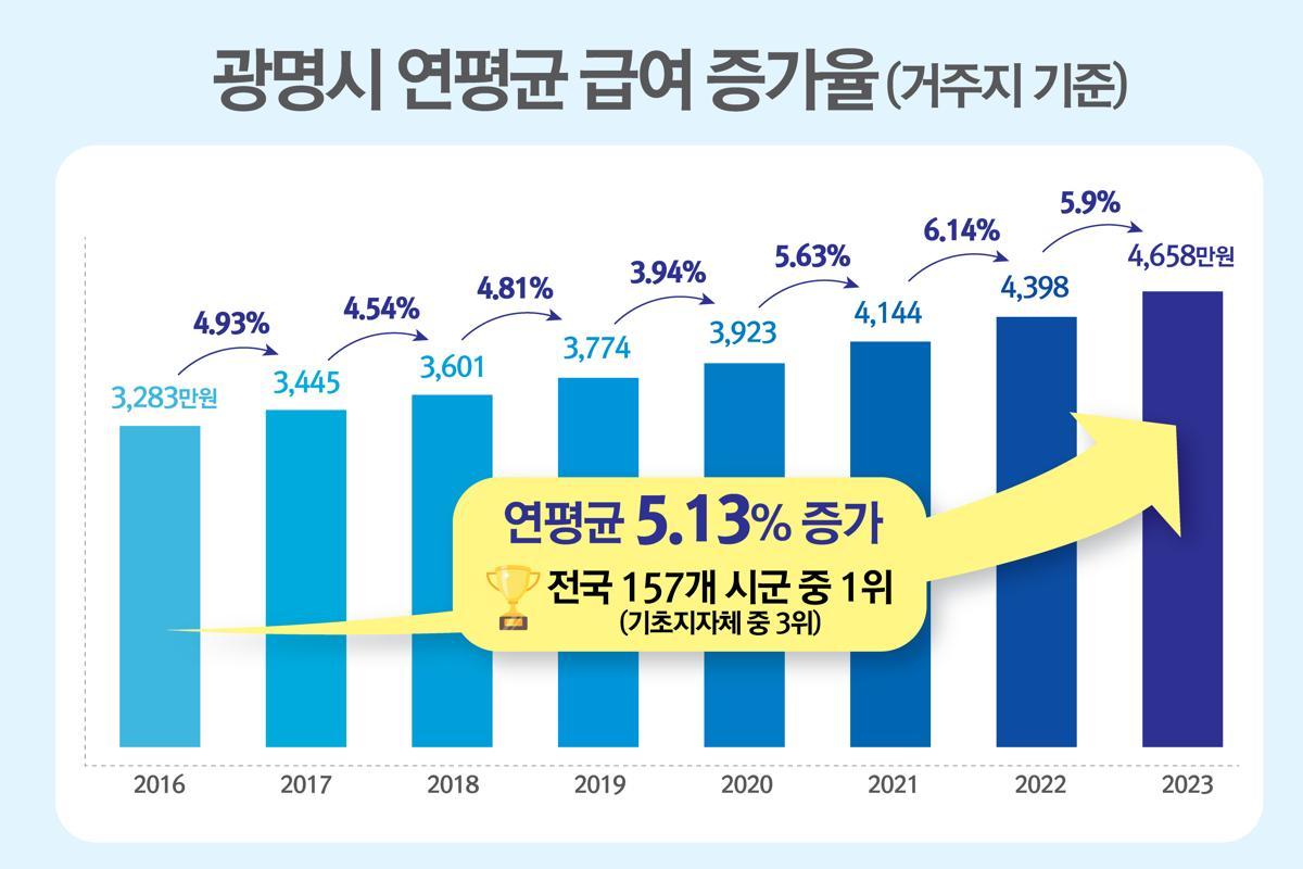 일하거나 연금 등으로 얻는 ‘근로소득’이 가장 많이 증가한 도시는 어딜까. 바로 경기 광명시다.국세청 ‘2024년 국세통계연보’를 보면 2023년 거주지 기준으로 광명시 평균 근로소득은 4658만 원이다. 2016년 3283만 원과 비교해 41.9%인 1375만 원이 늘었다. 2016년부터 해마다 평균 5.13% 증가한 셈인데, 전국 157개 시군 중 가장 높은 상승률이다.직장 기준으로도 같은 기간 3372만 원이던 평균 근로소득은 연평균 4.5%(1219만 원) 증가해 4591만 원으로 올랐다. 2020~2023년 전국 순위가 64위였지만 36계단이나 상승하며 28위까지 가파른 성장세를 보였다.광명시가 과거 서울의 베드타운에서 이제는 일하러 오는 도시로 꾸준히 성장하는 것을 방증한다. 유망기업 유치와 고소득 일자리를 만들어낸 성과라고 광명시는 분석했다. 재개발·재건축 사업, 교통·생활 인프라 개선으로 주거 환경과 접근성의 향상된 것도 긍정적인 영향을 미쳤다. 광명시흥 3기 신도시와 테크노밸리 등 큰 도시개발 사업이 완성되지 않은 상태에서도 지표가 개선되고 있는 것은 민선 7·8기 동안 추진했던 주거·경제 구조 개선 정책이 주효했다는 평가다.박승원 광명시장은 “베드타운으로 인식됐던 광명이 7년 만에 자족도시로서 도시 경쟁력을 입증했다”라며 “광명시흥 테크노밸리와 광명시흥 3기 신도시 같은 큰 도시개발 사업을 차질 없이 추진하고, 경제자유구역 지정으로 자족형 명품 도시로 거듭날 것”이라고 말했다.광명시는 현재 도시 전체 면적의 42%에서 개발사업이 진행될 정도로 수도권에서 가장 빠르게 변화하는 도시로 손꼽힌다. 신속한 재개발·재건축 사업 추진과 시설 복합화로 생활 SOC(사회간접자본)을 확충하고 교통망을 확대하는 등 주거 환경을 개선해 왔다.공공 일자리 정책도 지속적으로 강화해 지난해 일자리 목표를 112.9% 초과 달성하면서 1만5898건의 일자리를 만드는 성과를 냈다. 2020년에는 인구 50만 명품 자족도시를 준비하기 위해 기업유치팀(현 투자유치팀)을 새로 만들고 유망기업의 광명 이전도 적극 추진해 왔다. 11번가, 워터스코리아 등 기업 본사가 광명에 들어왔고, 기아 오토랜드 광명공장의 전기차 전용 공장 전환도 적극 지원하는 등 기업 성장과 민간 일자리 확대에도 노력하고 있다.조영달 기자 dalsarang@donga.com}