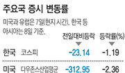버락 오바마 미국 대통령의 재선이 결정된 뒤 처음 열린 세계 주요국 증시가 일제히 하락세를 보였다. 미국 재정절벽과 유럽 경기둔화 우려가 겹쳤기 때문이다. 하지만 유럽시장 등은 이튿날 소폭 반등세로 출발했다. 코스피지수는 8일 전날보다 23.14포인트(1.19%) 떨어진 1,914.41로 거래를 마쳤다. 일본 닛케이평균주가도 1.51% 하락한 8837.15엔, 중국 상하이종합지수는 1.63% 내린 2071.51로 각각 마감했다. 이에 앞서 7일(현지 시간) 미국 증시도 2% 이상 급락했고 영국(1.58%), 독일(1.96%), 프랑스(1.99%) 등 유럽 주요국 증시도 큰 폭으로 하락했다. 그러나 유럽 주요국 증시는 8일(현지 시간) 하루 만에 소폭 반등하며 장을 시작했다. 오바마 대통령의 재선 성공으로 세계 금융시장을 뒤덮고 있던 불확실성이 상당 부분 해소됐는데도 글로벌 증시가 약세를 보인 것은 오바마 대통령의 재선으로 미국 재정절벽이 현실화할 것이라는 우려가 커졌기 때문이다. 미국 대선과 함께 치러진 미 의회 선거 결과 ‘오바마 대통령 대 공화당 주도의 하원’이라는 갈등 구도가 그대로 유지돼 재정절벽 문제의 신속한 해결을 기대하기 어려울 수 있다는 분석이 힘을 얻고 있다. 또 마리오 드라기 유럽중앙은행(ECB) 총재는 7일(현지 시간) 독일 프랑크푸르트에서 열린 ‘이코노미데이 2012’ 행사에 참석해 “유로존(유로화 사용 17개국)의 부채위기로 유럽 최대 경제 대국인 독일까지 악영향을 받기 시작했다”고 말했다. 유럽연합 집행위원회는 유로존의 내년 경제성장률 전망치를 기존 1%에서 0.1%로 크게 낮춰 불안감을 더욱 키웠다. 다만 향후 증시에 대한 긍정적 전망도 없지는 않다. 송상근 교보증권 리서치센터장은 “미국 정부와 의회가 적정한 수준에서 타협해 재정절벽에 대한 해결책을 도출하지 않겠느냐고 보는 이가 많다”고 말했다. 한편 8일 서울 외환시장에서 원-달러 환율은 전 거래일보다 3.90원 오른 1089.30원에 거래를 마쳤다. 이날 환율은 미 재정절벽 현실화 우려와 미국 증시 급락, 유로화 약세 등이 상승 압력으로 작용했다.김현지 기자 nuk@donga.com}