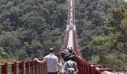 30일 전북 순창군 채계산 출렁다리를 찾은 나들이객들이 산 위에서 불어오는 산들바람을 맞으며 다리를 건너고 있다. 채계산 출렁다리는 국내 최장 무주탑 산악 현수교로 길이 270m, 높이는 75∼90m에 이른다. 박영철 기자 skyblue@donga.com}