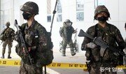 16일 광주 송정역 광장에서 육군 31사단 기동대가 차단경계를 하는 가운데 공군 1전비 폭발물제거반(EOD)이 역사에서 폭발물 의심물질을 제거하는 훈련을 하고 있다. 민관군 통합 방위훈련인 화랑훈련은 신종 코로나바이러스 감염증 여파 등을 이유로 4년 만에 재개했다. 박영철 기자 skyblue@donga.com}