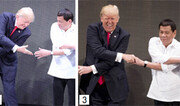 위압적인 악수로 상대방의 기선을 제압하는 것으로 유명한 도널드 트럼프 미국 대통령이 이번엔 악수 때문에 진땀을 흘렸다. [1] 13일 필리핀 마닐라에서 열린 제31차 아세안 정상회의 개막식에 참석한 트럼프 대통령(가운데)이 양손을 교차하는 ‘아세안식 악수’를 이해하지 못해 처음엔 오른쪽 응우옌쑤언푹 베트남 총리에게만 손을 내밀었다. [2] 자신의 실수를 알아챈 트럼프 대통령은 몸을 꼬아 왼쪽 로드리고 두테르테 필리핀 대통령에게 뒤늦게 손을 내밀었다. [3] 트럼프 대통령이 머쓱한 듯 “생큐”를 외치며 익살스러운 표정으로 해프닝을 마무리했다. 마닐라=원대연 기자 yeon72@donga.com·AP 뉴시스}