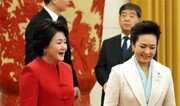 14일 중국 베이징 인민대회당에서 열린 공식 환영식에서 대통령 부인 김정숙 여사(왼쪽)와 시진핑 중국 국가주석의 부인 펑리위안 여사가 반갑게 대화하고 있다. 베이징=원대연 기자 yeon72@donga.com}