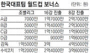 재물은 명예를 따라간다. ‘사상 첫 원정 16강’의 훈장을 단 태극전사들에게 두둑한 포상금이 주어진다. 대한축구협회 이사회는 3월 말 의결했던 대로 허정무 감독에게 3억 원, 선수들에겐 1인당 최대 1억7000만 원의 16강 진출 포상금을 지급하기로 했다. 16강 진출에 실패했던 2006년 독일 월드컵 당시(5000만 원)보다 큰 폭으로 상향 조정된 액수다. 원래 기본 포상금은 활약 정도에 따라 4등급으로 분류해 각각 7000만 원, 5000만 원, 3000만 원, 2000만 원에 불과했다. 여기에 16강 진출 성공에 따른 특별 보너스가 각각 1억 원, 9000만 원, 8000만 원, 7000만 원이 추가됐다. 박지성, 박주영 등 조별리그 3경기에서 맹활약한 A등급 선수들이 1억7000만 원을 받게 될 것으로 전망된다. 16강 진출을 진두지휘한 허 감독도 3억 원을 확보했다. 기본 포상금 1억5000만 원에 16강 진출 특별 보너스 1억5000만 원이 추가된 것이다. 포상금은 국제축구연맹(FIFA)이 본선 진출국에 주는 배당금에서 나온다. 본선에 진출한 32개국에는 기본적으로 900만 달러가 주어진다. 16강 진출 팀의 배당금은 탈락한 국가보다 100만 달러가 많은 1000만 달러다. 8강 진출 시에는 두 배 가까이로 늘어난 1900만 달러가 주어진다.유근형 기자 noel@donga.com▲다시보기=월드컵 첫 원정 16강 진출, 대한민국-나이지리아 경기 하이라이트}