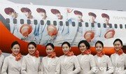 제주항공은 7일 서울 강서구 하늘길 김포공항에서 자사 홍보모델인 배우 이민호 씨의 모습을 래핑한 여객기 B737을 공개했다. 여객기 앞에 서 있는 승무원들은 신입 승무원들이다. 제주항공 제공}