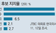 더불어민주당 문재인 대선 후보와 국민의당 안철수 후보가 오차범위(±3.1%) 내에서 초접전을 벌이는 것으로 나타났다고 12일 JTBC가 보도했다. JTBC가 한국리서치에 의뢰해 11, 12일 조사한 결과 안 후보 지지율은 38.3%로 문 후보(38%)와 팽팽하게 맞섰다. 이어 자유한국당 홍준표 후보(6.5%), 정의당 심상정 후보(2.7%), 바른정당 유승민 후보(2.1%) 순이었다. 지역별로는 안, 문 두 후보가 서울 등 대부분 지역에서 오차 범위 내 접전을 벌인 가운데 문 후보는 지난주 같은 조사보다 대구·경북 지역에서 두드러진 상승세를 나타냈다. 안 후보는 부산·울산·경남 지역에서의 상승세가 컸다. 지난주 대구·경북 지역에서 26.7%의 지지율을 기록한 문 후보는 이번 주는 35.5%로 상승해 안 후보(29.9%)를 제쳤다. 지난주 부산·울산·경남 지역에서 지지율이 22.9%였던 안 후보는 이번 주 34.1%로 올라 문 후보(37.5%)를 추격했다. 연령대별 지지 후보 역시 변동이 컸다. 30대에선 안 후보가 이전 조사 대비 11.8%포인트 상승한 35.5%를 기록했다. 반면 문 후보는 30대에서 이전 조사 대비 4.8%포인트 하락한 51.9%의 지지를 얻었다. 자세한 내용은 중앙선거여론조사심의위원회 홈페이지 참조.문병기 기자 weappon@donga.com}