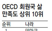 현재의 삶에 만족하는 한국인은 10명 중 4명도 안 되는 것으로 나타났다. 23일 경제협력개발기구(OECD)가 발표한 ‘더 나은 삶: OECD 회원국 복지 지표’ 보고서에 따르면 한국인 중 36%만이 삶에 만족한다고 답했다. OECD 평균(59%)보다 크게 밑도는 것으로 조사 결과가 발표되지 않은 스웨덴을 제외한 33개 회원국 가운데 24번째다. 2008년부터 회원국의 각종 통계 자료들을 모아 조사한 OECD 보고서는 나라별 복지상태를 주거, 소득, 공동체, 일자리, 교육, 환경, 일과 삶의 균형 등 11개 분야로 측정하고 있다. 한국은 교육 부문을 제외하고 나머지 분야에서는 OECD 평균보다 열악한 것으로 나타났다. 한국은 만 25∼34세 이상 인구의 98%가 고등학교를 졸업(OECD 평균 80%)하고 문맹률이 최저로 나타나는 등 교육 부문에서는 월등했다. 하지만 투표 참여율은 63%로 OECD 평균(72%)에 못 미쳤으며 통치기관에 대해서는 국민의 41%만이 ‘믿을 수 있다’고 답하는 등 정치 참여나 공동체 의식과 관련된 부문은 저조했다. 또 한국인은 연간 2256시간을 일해 OECD 회원국 평균(1739시간)보다 500시간 정도 더 일하는 것으로 나타나 노동 강도에서도 가장 센 국가로 분류됐다.신나리 기자 journari@donga.com}