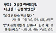 #. 몽롱한 ‘안개화법’ 지속하는 황교안 대행대통령 출마?? 불출마??#. (출마 생각이) 전혀 없다“지난해 12월 20일”(기자들 질문에 답변 않은 채) 문 조심하세요.“2월 2일”(지지율이 15를 넘었는데 한 마디 해 달라)지금 길이 막혀 있어요.“2월 6일”(대선 관련 입장을 밝힐) 적당한 때가 있을 겁니다“2월 7일 국회#. 황교안 대통령 권한대행의 발언 변화입니다.이달 2일부터 국회를 방문한 그는나흘간 25차례에 걸쳐 대선 출마 질문 세례를 받은 끝에”적당한 때가 있다“는 입장을 내놨죠.지난해 12월 ”전혀 없다“던 것과 확연히 다릅니다.#. 태도도 한결 여유로워졌는데요.7일 국회 본회의장 앞 로텐더홀 계단을 오르던그는 경호원들이 길을 열기 위해 기자들과 몸싸움을 벌이자부드러운 표정으로 ”놔둬 놔둬. 괜찮아“라고 경호원을 제지했죠.질문 공세를 펴는 한 기자의 팔을 가볍게 툭툭 치기도 했고요.#. 새누리당은 유일한 대안으로 그를 꼽습니다.”보수 진영의 진짜 대선 주자는탄핵 선고가 난 뒤인 4월에 나올 것이다.탄핵 후 박근혜 대통령에 대한 동정 여론이 일면대선 국면이 달라질 수 있다“새누리당 한 중진 의원#.새누리당은 대통령 탄핵안이 인용되면‘태극기 민심’이 결집하면서황 권한대행의 지지율이 올라갈 것이며‘반(反)문재인 연대를 결성할 수 있을 것으로 기대합니다.”지역민들이 (황 권한대행을) 메시아처럼 기다리고 있다“대구경북 지역 한 의원#. 물론 그가 출마하지 못할 것이란 반론도 많습니다.탄핵 심판 전에는 대통령을 배신했다는 여론을 우려해 출마 선언이 어렵고탄핵안이 인용되면 현 정부의 상징적 인물로 지목돼정권교체 프레임에 갇히는황교안 딜레마죠.#.그가 중심인 ’반문 연대‘의 실현가능성에도 의문이 많죠.”총체적 난국을 관리해야 하는 황 권한대행이대선주자로 거론되는 것 자체가 어불성설“김영우 바른정당 의원#. 다른 대선주자들도 그를 강하게 견제합니다.”황 권한대행은 박근혜 정부 실패를 책임지고현 국가 상황을 수습해야 한다.대선에 나오면 안 되는 사람“안철수 국민의당 전 상임공동대표#. 문재인 더불어민주당 전 대표는7일 채널A ’외부자들‘과의 통화에서”국정이 중단될 수 없으니 권한대행을 하고 있는 건데그가 대선에 나서면 ’권한대행의 대행‘을 구해야 하나?이는 체면이 없는 것“이라고 비판했죠.#. 모호한 행보로 궁금증을 증폭시키고 있는 황 권한대행.과연 그가 출마할까요?갈수록 치열해지는 대선 싸움의 최종 승자는 누구일까요? 2017.02.08 (수)원본 : 문병기·홍수영 기자기획·제작 : 하정민 기자·김한솔 인턴}