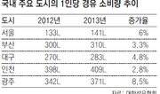 디젤 자동차 판매 증가로 지난해 국민 1인당 경유 소비량 증가율(전년 대비)이 휘발유의 갑절 이상이었던 것으로 나타났다. 대한석유협회는 한국석유공사와 통계청 자료를 분석한 결과 지난해 국민 1인당 평균 경유 소비량은 438L로 2012년(419L)보다 4.5% 늘어났다고 2일 밝혔다. 같은 기간 1인당 휘발유 소비 증가율은 2.1%로 경유의 절반에도 못 미쳤다. 지난해 국민 1인당 휘발유 소비량은 240L였다. 경유 소비량이 늘어난 원인으로는 디젤 차량의 판매 증가가 꼽혔다. 한국자동차산업협회와 한국수입자동차협회(KAIDA)에 따르면 지난해 국내에서 판매된 디젤 차량은 총 45만4986대로 전년(38만5389대)보다 18.1% 늘었다. 국산 디젤차는 전년 대비 12.3% 늘어난 총 35만7801대가 팔렸다. 수입 디젤차의 경우 전년 대비 45.8% 늘어난 9만7185대가 판매됐다. 지역별로는 수입 디젤 차량 등록이 많은 서울 서초구의 경우 1인당 평균 경유 사용량이 337L로 서울시 평균(141L)의 2.4배 수준이었다. 석유협회 관계자는 “서울 등 도심에서 사용하는 경유는 주로 차량 연료로 활용된다”며 “디젤 차량이 늘어나면서 경유 소비량도 증가한 것”이라고 설명했다.강홍구 기자 windup@donga.com}