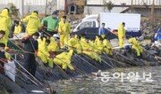 2일 오전 11시 전남 여수시 신덕동 신덕마을 바닷가. 흡착포 수천 개가 바다에 흉물스럽게 떠 있었다. 신덕마을 주민 곽금자 씨(73·여)는 해안가에서 시커먼 원유가 달라붙은 흡착포를 건지던 중 “설날부터 마을 주민 400여 명이 유출된 원유 제거작업에 3일째 매달리고 있는데 역부족”이라며 한숨을 내쉬었다. 신덕마을은 1월 31일 원유 유출사고가 발생한 여수 낙포 원유 2부두 GS칼텍스 선석(잔교)에서 3km 정도 떨어진 곳. 선석은 유조선이 원유를 내리기 위한 시설로 낙포 원유 1·2부두에 8개가 있다. 유출사고가 발생한 직후 시커먼 원유가 신덕마을 해안 양식장을 덮쳤다. 신덕마을 위쪽에 오일펜스를 설치했지만 이미 원유가 해안가에 유입된 뒤였다. 신덕마을은 135어가가 양식장 120.8ha(약 36만 평)에 바지락 개조개 톳 미역 등을 키우고 있다. 어촌계장 김정기 씨는 “신덕마을은 1995년 7월 사파이어호가 GS칼텍스 선석에 원유를 내리기 위해 접안하다 암초를 들이받아 원유가 유출돼 피해를 봤다. 또다시 같은 인재(人災)가 반복돼 바지락 등 어장 120ha 전부가 황폐화할 것”이라며 말을 잇지 못했다. 원유 유출사고 직후 조류와 바람의 영향으로 신덕마을 쪽으로 원유가 흘렀다. 사고 지점에서 12km 떨어진 청정해역 한려수도나 여수엑스포장까지는 아직 원유가 유입되지 않은 것으로 알려졌다. 사고 사흘째인 이날 사고 지점에서 남쪽으로 1010함 등 해경 경비함 10여 척이 바닷물을 쏘아 원유 띠나 기름막(유막)을 분쇄하는 작업에 몰두했다. 소량의 원유 띠는 사고 지점에서 오동도 앞바다로 유입된 것으로 알려졌다. 김석균 해양경찰청장은 “2일 경남 남해 쪽 해안에 기름막이 넓게 형성됐고 일부는 노량해협까지 흘러갔지만 3일경에는 방제 작업을 마무리할 것”이라고 말했다. 여수해경은 이번 원유 유출사고가 1월 31일 오전 10시 싱가포르 국적 16만 t급 유조선 W호가 원유를 내리기 위해 GS칼텍스 선석에 접근하다가 발생한 것으로 보고 있다. W호가 선석 안쪽 30도 각도로 돌진하면서 지름 45∼91cm의 원유·나프타·디젤 송유관 4개가 200m 정도 무너지거나 바닷속으로 주저앉은 상태다. 원유는 바다를 오염시켰고 나프타는 악취를 유발했다. 여수해경은 W호가 접안을 할 때 시속 3.7km 이하로 접근해야 하지만 시속 11km로 돌진한 것을 확인했다. 과속으로 속도를 줄이지 못해 정상 운항 궤도를 벗어나 선석 안쪽으로 500m 돌진한 것으로 보인다. W호의 선장 김모 씨(38), 유조선 정박을 안내하는 도선사 2명이 운항 부주의로 사고를 냈다고 보고 처벌할 것으로 예상된다. 한편 사고 발생 시간과 관련해 신덕마을 통장 조현근 씨(67)는 “1월 31일 오전 9시 35분 원유 냄새가 나 어선을 몰고 바다로 나가 보니 기름띠가 밀려오고 있었다”며 “모래나 갯바위에 묻은 원유를 제거하는 데 최소 2주일 정도가 걸릴 것 같다”고 말했다. 김 청장은 사고현장에서 “원유 유출량이 1만 L라고 예상했지만 여러 사항을 고려해 정확한 양을 추산 중”이라고 말했다. 원유 드럼통 1개는 200L. 일부에서는 송유관 길이, 지름 등을 감안해 10만 L 이상이 유출됐을 것이라고 우려하고 있지만 유출량은 1만∼2만 L 수준일 것으로 추정된다. 여수=이형주 peneye09@donga.com / 강홍구 기자}