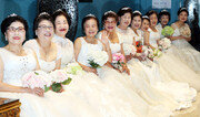 15일 오후 서울 종로구 성균관컨벤션웨딩홀에서 열린 '어르신 꽃피는 웨딩쇼'에서 어르신들이 결혼식에 앞서 웨딩드레스를 입고 기념촬영을 하고 있다. 최혁중 기자 sajinman@donga.com}