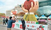 5일 서울광장에서 열린 ‘2019 경북착한사과 페스티벌’의 조형물 앞에서 시민들이 기념 촬영을 하고 있다. 이날부터 7일까지 열리는 페스티벌에는 사과 반값 할인 판매, 시식회 등이 마련됐다. 경북 지역은 전국 사과 생산량의 66%를 차지한다.최혁중 기자 sajinman@donga.com}