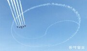공군 특수비행팀 블랙이글스에 소속된 국산 초음속 고등훈련기 T-50B 편대가 25일 서울 광화문 상공에 태극 문양을 만들어 보이고 있다. 블랙이글스는 3·1절 100주년 기념행사 축하 비행을 앞두고 이날 오전과 오후 두 차례에 걸쳐 서울 상공에서 곡예비행을 하는 등 사전 연습을 했다. 박영대 기자 sannae@donga.com}