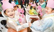 4일 열린 서울 종로구 재동초등학교 입학식에서 한복을 입고 왕관을 쓴 신입생들이 손을 맞잡으며 웃고 있다. 재동초는 지난해부터 신입생들이 한복을 입고 입학식에 참석하도록 하고 있다. 올해 이 학교에는 31명이 입학했다. 박영대 기자 sannae@donga.com}