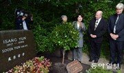 문재인 대통령의 부인 김정숙 여사(가운데)가 5일 오후(현지 시간) 독일 베를린 가토 공원묘지에 있는 고 윤이상 선생의 묘지를 참배한 뒤 박영희 전 브레멘음대 교수(왼쪽), 발터볼프강 슈파러 국제윤이상협회 회장과 이야기를 나누고 있다. 김 여사는 이날 윤이상 선생의 고향인 경남 통영에서 가져온 동백나무를 윤 선생의 묘지 앞에 심었다. 베를린=원대연 기자 yeon72@donga.com}