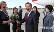 6일(현지 시간) 독일 함부르크의 헬무트 슈미트 공항에 도착한 문재인 대통령이 꽃다발을 받으려다 멋쩍은 웃음을 짓고 있다. 문 대통령은 독일 측 관계자들이 자신에게 주려고 꽃다발을 준비한 것으로 생각했지만, 주최 측이 “부인을 위한 것”이라고 설명하자 주변 사람들과 함께 크게 웃었다. 김정숙 여사는 꽃다발을 받은 뒤 감사의 마음을 표했다. 함부르크=원대연 기자 yeon72@donga.com}