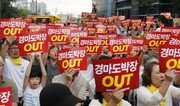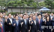 김장겸 MBC 사장 체포영장 발부를 둘러싼 여야의 대결이 청와대 앞 항의 방문으로 이어졌다. 정기국회 보이콧을 선언하고 장외투쟁에 나선 자유한국당 정우택 원내대표(앞줄 가운데 안경 쓴 인물)와 한국당 의원들이 5일 청와대 항의 방문 직후 청와대 분수대 앞에서 청와대의 언론탄압을 규탄하는 구호를 외치고 있다. 한국당은 다만 문재인 대통령의 방러 기간에는 장외투쟁을 중단하겠다고 밝혔다. 원대연 기자 yeon72@donga.com}