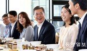 문재인 대통령이 31일 정부세종청사 구내식당을 방문해 ‘다둥이(다자녀) 공무원’ 등 20여 명과 점심식사를 하며 육아와 근무 고민을 나누고 있다. 이날 마지막 부처별 업무보고를 받은 문 대통령은 “정부가 제출한 예산안을 복지 증가, 성장 감소라고 평가하는 것은 낡은 관점”이라며 “저출산, 일자리, 격차 해소에 드는 예산은 고용적 성장과 소득 주도 성장의 길”이라고 강조했다. 세종=원대연 기자 yeon72@donga.com}