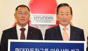 현대자동차그룹은 20일 나눔 경영을 실천하기 위해 사회복지공동모금회에 성금 250억 원을 기탁했다. 현대차그룹은 사회복지공동모금회가 ‘희망 2014 나눔 캠페인’을 시작한 첫날 1호 기부자로 성금을 냈다. 현대차그룹은 2003년부터 올해까지 총 1340억 원을 사회복지공동모금회에 기탁했다. 2011년부터는 매년 기탁금을 전년보다 50억 원 더 내고 있다. 이날 서울 중구 정동 사회복지공동모금회에서 열린 기탁 행사에는 정의선 현대차 부회장(왼쪽)과 이동건 사회복지공동모금회장 등이 참석했다. 정 부회장은 “내년에도 경영 환경이 쉽지 않지만 이럴 때일수록 더 힘들어지는 이웃들을 기억하고 주위를 돌아보며 함께 성장하는 기업이 될 것을 약속한다”고 말했다.}