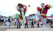 22일 경북 영덕군 병곡면 고래불해수욕장 옆 들녘을 찾은 시민들이 허수아비를 감상하며 산책을 하고 있다. 영덕군은 다음 달 2∼4일 이곳에서 허수아비 900여 점을 전시하는 축제를 연다. 영덕군 제공}