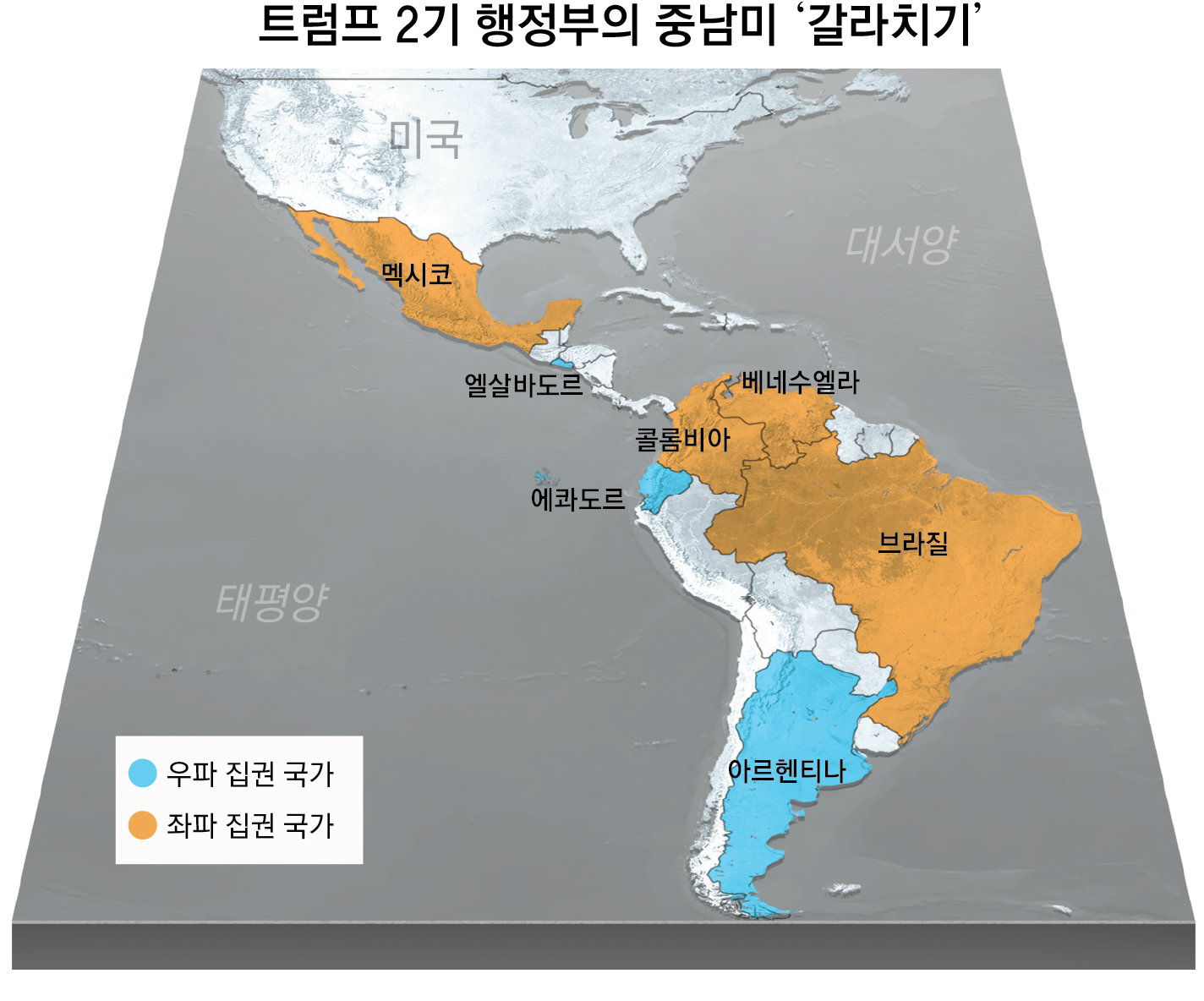 “도널드 트럼프 행정부는 과거 미국 대통령들이 ‘뒷마당’인 중남미 국가들을 지배하려고 했던 역사적 열망을 되살리고 있다.”(CNN) 최근 트럼프 행정부가 새로운 국방전략(NDS)에서 본토 및 서반구 안보를 최우선 순위에 두기로 할 것으로 알려진 가운데, 중남미 국가들에 대해 상반된 정책을 펼치고 있어 주목된다. 아르헨티나, 엘살바도르, 에콰도르 등에 대해선 ‘내정 간섭’ 논란이 나올 정도로 선거 직전 대규모 지원을 발표하는 등 전폭적으로 지원하고 있다. 반면 베네수엘라, 콜롬비아, 멕시코 등에는 미국으로 마약을 보내고 있다는 이유로 고율 관세를 때리거나 각종 지원을 끊고 있다. 또 트럼프 대통령은 기회가 될 때마다 트루스소셜을 통해 이 나라들의 정상들을 비난한다. 트럼프 대통령의 이 같은 ‘갈라치기 전략’은 중남미 각국에서 집권 중인 정부 성향에 따라 나뉜다. 특히 그가 압박 중인 좌파 정부들이 중국과 밀착하고 있다는 공통점이 있다. 이에 따라 트럼프 대통령의 중남미 국가들에 대한 정책에 중국 견제 의도가 담겨 있다는 해석도 나온다. ● 美, 우파 아르헨-엘살바도르-에콰도르 지원최근 하비에르 밀레이 대통령이 아르헨티나 중간선거에서 예상을 깨고 승리한 데는 트럼프 행정부의 강력한 지원이 있었다. 중간선거를 앞두고 페소화 가치와 주가가 급락하며 밀레이의 지지율이 하락하자, 미 재무부는 최대 21억 달러(약 3조 원)에 달하는 페소를 사들였다. 앞서 트럼프 행정부는 선거를 코앞에 두고 아르헨티나와 200억 달러(약 29조 원) 규모의 통화 스와프를 체결하고, 200억 달러의 별도 금융 지원을 약속했다. 특히 트럼프 대통령은 아르헨티나에 대한 금융 지원이 밀레이가 이끄는 집권여당 자유전진당이 중간선거에서 승리하는지에 달려 있다고 강조했다. 이에 힘입어 자유전진당이 선거에서 크게 승리하자, 아르헨티나 안팎에선 내정 개입 논란이 일었다. 트럼프 행정부는 ‘중남미 마약 카르텔 해체’를 명분으로 대규모 범죄조직 소탕에 나선 엘살바도르, 에콰도르의 강경 우파 정권과도 긴밀한 관계를 맺고 있다. 나이브 부켈레 엘살바도르 대통령은 미국의 ‘교도소 아웃소싱(외주화)’ 방침을 적극 수용하면서 트럼프 행정부와 밀착하고 있다. 미국은 올 3월 600만 달러(약 85억 원)를 주고 미국에 불법 체류 중인 베네수엘라의 마약 카르텔 ‘트렌 데 아라과’ 등 갱단원 260여 명을 엘살바도르의 악명 높은 교도소인 ‘테러범수용센터(CECOT)’에 이송하기로 했다. 에콰도르의 다니엘 노보아 대통령도 강경 보수 성향의 친트럼프 인사다. 2023년 집권한 노보아 대통령이 ‘테러와의 전쟁’을 선언하고 마약 밀매 조직을 단속하자, 트럼프 행정부는 전폭적으로 지지하고 나섰다. 올 9월 에콰도르를 찾은 마코 루비오 미 국무장관은 노보아 대통령과 만나 2000만 달러(약 280억 원) 규모의 범죄 퇴치 자금 지원을 약속했다.● 폭격, 원조 중단, 관세 등으로 반미 국가 압박트럼프 대통령은 반미(反美) 성향이 강한 중남미 국가에는 취임 후 줄곧 압박을 가하고 있다. 최근 마약 밀수를 이유로 미국의 해상 공격을 받고 있는 베네수엘라 선박이 대표적이다. 트럼프 행정부가 9월 이후 베네수엘라 마약 밀수 선박을 공격했다고 공식적으로 밝힌 것만 10차례가 넘는다. 사망자 수는 50명을 넘어섰다. 압박은 여기에 그치지 않는다. 트럼프 대통령은 지난달 15일 “베네수엘라는 자국의 죄수를 미국에 풀었다. 또 베네수엘라에서 들어오는 마약이 아주 많다”며 미 중앙정보국(CIA)의 베네수엘라 영토 내 비밀작전을 승인했다. 이와 함께 미 해군 구축함을 베네수엘라와 인접한 섬나라 트리니다드토바고에 배치하고, 공군 폭격기로 베네수엘라 상공을 비행하는 등 무력 시위도 벌였다. 미 법무부는 니콜라스 마두로 베네수엘라 대통령의 마약 밀매 증거를 제공하는 사람에게 5000만 달러(약 715억 원)의 현상금을 지급하겠다고 발표했다. 9·11테러를 일으킨 알카에다 지도자 오사마 빈 라덴에게 걸렸던 현상금의 두 배다. 콜롬비아도 마약 밀매를 이유로 미국의 압박을 받고 있다. 지난달 19일 트럼프 대통령은 트루스소셜에 “구스타보 페트로 콜롬비아 대통령은 불법 마약 지도자”라고 썼다. 세계 최대 코카인 생산국인 콜롬비아는 그동안 미국의 지원을 받아 코카인 밀매 차단에 앞장서 왔다. 하지만 2022년 8월 취임한 페트로 대통령이 좌파 성향이란 점이 트럼프의 심기를 건드렸다. 트럼프 행정부는 올 9월 콜롬비아가 최근 1년간 미국의 대외원조법에 따른 마약 통제 의무를 이행하지 않았다며 지원 중단 결정문을 의회에 발송했다. AP통신은 “미국의 콜롬비아에 대한 지원금은 연간 7억 달러(약 1조70억 원)를 상회했으나, 이번에는 2억3000만 달러(약 3308억 원) 규모였다”고 전했다. 페트로 대통령이 9월 뉴욕 유엔총회에 참석할 당시 친팔레스타인 시위에 참석하자, 그의 미국 비자를 취소하기도 했다. 페트로 대통령은 “내가 수십 년간 마약 밀매와 싸워 왔고 효과적으로 대응하며 도왔던 (미국) 정부로부터 이런 조치를 받게 됐다”고 했다. 미국의 최대 교역국 중 하나이며 국경을 맞댄 이웃 나라