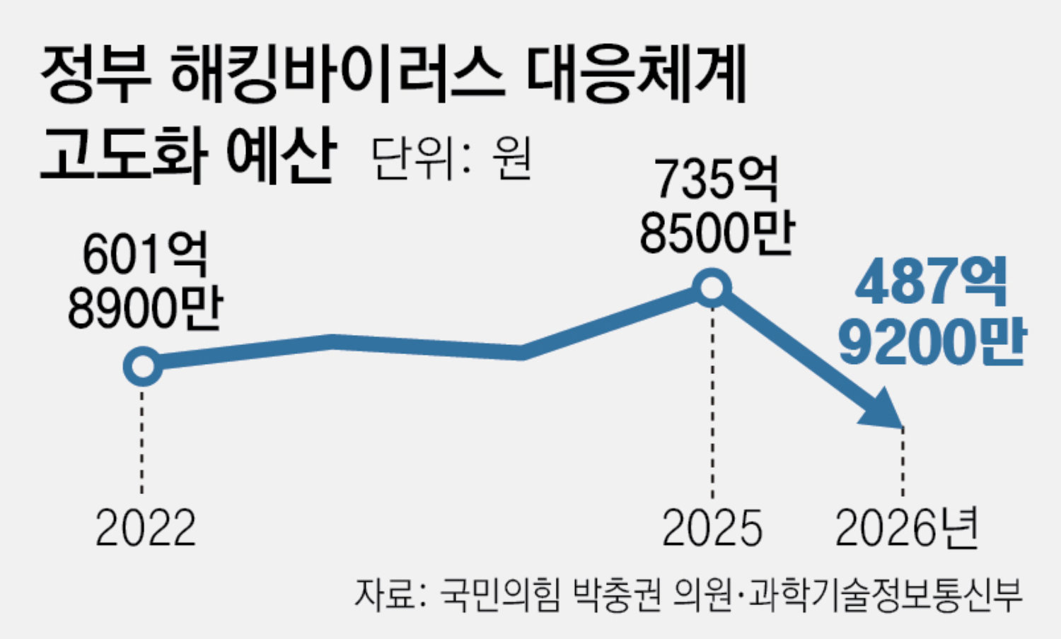 정부와 기업을 겨냥한 해킹 사고가 급증하고 있는 가운데 정부가 내년도 해킹 대응 예산을 올해 약 736억 원에서 488억 원으로 대폭 삭감한 것으로 나타났다. 9일 국회 과학기술정보방송통신위원회 소속 국민의힘 박충권 의원이 과학기술정보통신부로부터 제출받은 ‘해킹바이러스 대응체계 고도화 예산 및 사업’ 자료에 따르면 정부가 내년 해당 사업에 편성한 예산은 487억9200만 원이다. 이는 올해 735억8500만 원에서 약 247억9300만 원이 줄어든 규모다. 앞서 정부는 해킹 대응 예산으로 2022년 601억8900만 원, 2023년 641억3700만 원, 지난해엔 621억2500만 원을 배정했다. 올해 예산 대비 삭감된 해킹 대응 예산은 악성코드 탐지체계 운영비(138억 원), 사이버 위협정보 분석 공유체계 운영비(45억 원), 인터넷 침해대응센터 운영비(40억 원) 등이었다. 과기정통부에 따르면 악성코드 탐지체계 운영 사업은 365일 24시간 인터넷 이용환경 이상 징후를 모니터링하고 침해 사고를 대응하는 역할을 한다. 이 예산을 바탕으로 지난해 한국인터넷진흥원(KISA)은 접수된 국내 침해사고 1887건을 대응했다. 사이버 위협정보 분석 공유체계 사업은 사이버 위협정보를 공유하는 국내외 공동대응 협력체계를 확대하는 사업으로 현재까지 4408개 회원사가 참여하고 있다. 과기정통부는 이번 예산 삭감에 대해 “신규 사업 기획 및 관련 예산 재원 마련을 위한 자구책으로 기존 사업 비용을 절감했다”고 설명했다. 과기정통부는 내년 예산에서 인공지능(AI) 인력 양성, 공공AI클라우드 서비스 개발 지원 등 AI 관련 예산을 대폭 늘렸다. 하지만 해킹 신고가 늘어나는 상황에서 예산이 대폭 삭감됨에 따라 정부의 해킹 대응 능력에 대한 우려가 나온다. KISA에 따르면 국내 민간 분야 침해사고 신고 건수가 2021년 640건에서 지난해 1887건으로 약 3배로 증가했고, 서버해킹 신고는 4년간 약 6.4배, 디도스 공격은 같은 기간 2.3배 늘었다. 해킹으로 인한 피해도 늘어 올 4월에는 SK텔레콤에서 대규모 유심 정보 해킹 사태가 벌어졌으며 KT에서 최근 해킹과 무단 소액결제 피해가 발생했다. 박 의원은 “이재명 정부가 해킹 사고가 빈발하는 상황에서 사이버 보안 대응 예산을 대폭 삭감한 것은 매우 우려스럽다”며 “AI 등 신규 사업 추진과 병행해 보안 역량 강화에도 충분한 재정 투입이 필요하다”고 말했다.이채완 기자 chaewani@donga.com}