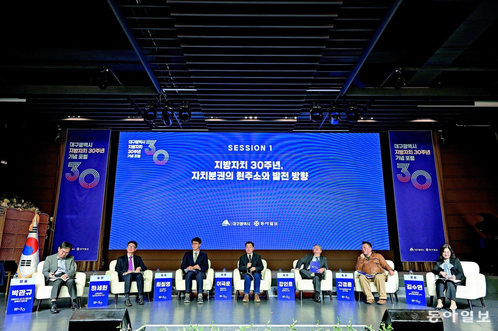 “지방정부 스스로 할 일을 결정하고 결과에 책임을 지는 제도 개선이 절실합니다.”박관규 대한민국시도지사협의회 정책연구센터장은 22일 대구시 북구 삼성창조캠퍼스 중앙컨벤션센터에서 열린 ‘지방자치 30주년 기념 포럼’에서 재정 분권 발전 방향의 조건 가운데 하나를 이렇게 말했다. 그러면서 그는 미래 지방자치 30년을 위한 필요조건과 충분조건을 제시했다.박 센터장은 필요조건으로 자치입법권, 자치조직권, 자치재정권, 자치재정관리권의 확보를 주문했고, 충분조건으로는 지방정부와 공무원 개인의 역량 강화, 그리고 국회·감사원·중앙부처의 외부 통제보다 지방의회·자체 감사·주민소환·감사청구 등 자율 통제를 강화하는 시스템 혁신을 강조했다.특히 지방의 낮은 재정자립도와 재정자주도의 하락 추세를 극복하기 위해 “국세·지방세·국고보조금 등의 비중을 조정하고 궁극적으로 재정자주도를 상향해야 한다”고 역설했다. 재정자립도는 지자체가 자체 수입으로 재정을 충당하는 비율, 재정자주도는 중앙정부의 간섭 없이 자율적으로 쓸 수 있는 재원의 비율을 뜻한다. 박 센터장은 또 “자치재정관리권은 투자 타당성 조사 전문 기관을 시·도 출연기관으로 확대하고, 지방정부가 재정 상황에 맞춰 지방채 발행 한도액을 자율적으로 설정할 수 있도록 하는 방향으로 확충해야 한다”고 설명했다.● 대구서 ‘지방자치 30년’ 자성(自省)의 장이날 지방자치 30주년 기념 포럼은 대구시와 동아일보가 공동 주최했다. 지방자치의 날(10월 29일)을 앞두고 열린 이번 포럼은 단순한 기념행사를 넘어, 30년간의 자치 성과와 한계를 돌아보고 향후 분권 방향을 점검하는 자리였다.대구시는 이번 행사를 ‘대구 시민과 함께하는 지방자치 주간’의 주요 프로그램으로 구성해 전국 각지의 지방자치 현안을 공유하고, 앞으로 50년의 자치분권·균형발전 비전을 논의했다.김경수 대통령 직속 지방시대위원회 위원장은 영상 축사에서 “대구에서 열리는 지방자치 30주년 포럼이 뜻깊다”며 “대구는 자치와 혁신, 균형발전의 모범 도시로서 성장 잠재력이 큰 도시”라고 말했다. 그는 “영남권 광역경제권의 허브로서 산업과 문화, 청년 인재가 어우러지는 대구의 도전은 ‘지역이 곧 국가 경쟁력’이라는 인식을 확산시키는 출발점이 될 것”이라고 강조했다.1995년 전국동시지방선거로 시장과 지방의원을 직접 뽑기 시작한 지 30년. 그동안 지방자치는 중앙집권 구조 속에서 권한을 분산하고 정치의 중심을 지역으로 옮기는 변화를 거듭해 왔다. 대구 역시 그 흐름 속에서 시민 참여와 숙의 과정을 통해 행정 결정을 바꾼 대표적 도시로 평가받는다.대표적 사례가 신청사 건립 과정이다. 15년간 표류하던 사업은 2019년 시민 250명이 참여한 공론화위원회가 숙의 과정을 거쳐 입지를 결정하면서 새로운 전환점을 맞았다. 전국 최초로 대규모 공공사업의 입지를 시민 공론화 방식으로 결정한 사례로, 과열 경쟁과 지역 갈등을 시민 합의로 극복했다는 점에서 의미가 크다.대구는 또 2011년 전국 최초로 지방분권 조례를 제정하고 이듬해 지방분권협의회를 설치하는 등 제도적 기반을 일찍부터 마련했다. 이후 주민참여예산제와 ‘분권 토크’ 같은 시민 참여 프로그램을 이어오며 행정의 투명성과 참여성을 높였다. 반면 시민 참여가 형식에 그치지 않도록 지속적인 제도 보완이 필요하다는 지적도 나온다.코로나19 확산기에는 범시민 대책위원회가 자율적으로 구성돼 ‘대구형 방역 수칙’을 제정하며 공동체 대응 모델을 보여줬다. 하지만 지역 간 정보 공유 체계나 행정 대응 속도에서는 여전히 중앙 의존도가 높다는 한계도 드러났다.전문가들은 이번 포럼이 대구의 사례를 넘어 지방자치 전반의 ‘시민 중심 행정이 제도로 안착했는가’를 점검하는 계기가 돼야 한다고 평가했다. 안중곤 대구시 행정국장은 “자치가 제도의 틀을 넘어 생활문화로 자리 잡아야 진정한 지방자치가 완성된다”고 말했다.● 미래 지방자치 50년의 방향 논의이날 포럼에서는 각계 전문가들이 모여 미래 지방자치의 모델과 방향을 논의했다.이선호 대통령실 자치발전비서관은 ‘정부의 자치분권 정책 방향’을, 김중석 지방시대위원회 민간위원은 ‘지방자치 30년의 어제와 내일’을 주제로 특강했다.첫 번째 세션에서는 ‘지방자치 30년, 대한민국 자치분권의 현주소와 발전 방향’을 주제로 토론이 열렸다. 박관규 센터장에 이어 김수연 제주대 법학전문대학원 교수가 ‘분권형 개헌의 필요와 방향’을 발표하며 “지방분권형 개헌은 더 이상 미룰 수 없는 시대적 과제이자, 권력 분산을 통한 민주주의의 고도화”라고 말했다. 이어진 패널토론에서는 이국운 한동대 교수를 좌장으로 하세헌(경북대)·최철영(대구대)·강인호(조선대) 교수와 고경훈 한국지방행정연구원 연구위원이 참여해 자치분권형 개헌과 지방의 책임성 강화 방안을 논의했다.두 번째 세션에서는 ‘5극 3특(5개 초광역권과 3개 특별자치도) 정부 정책과 연계한 대구 지역 성장·발전 방향’을 주제로 발표와 토론이 이어졌다. 김주석 대구정책연구원 공간교통연