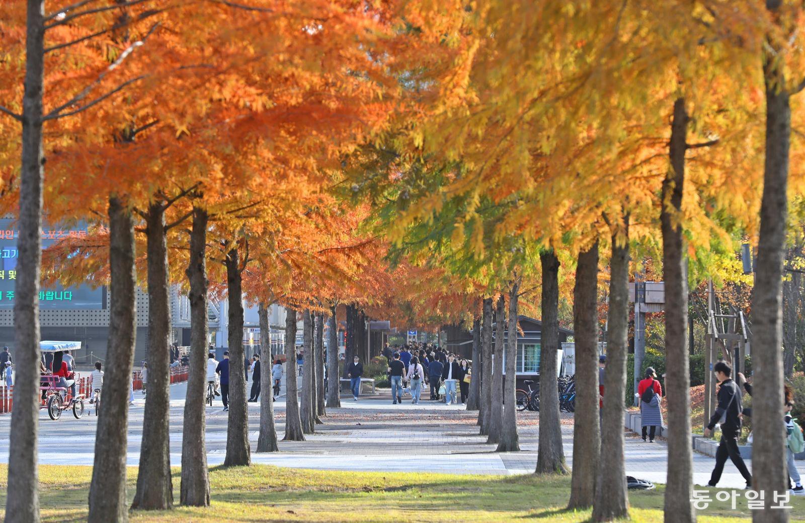 9일 대전 서구 대전엑스포시민광장을 찾은 시민들이 알록달록 물든 단풍 아래를 거닐며 가을 분위기를 만끽하고 있다. 김태영 기자 live@donga.com}