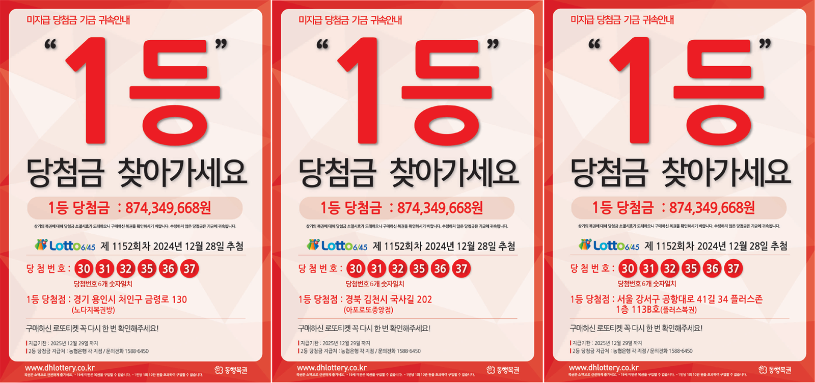지난해 12월 28일 추첨한 로또복권 1152회차 1등과 2등 당첨금 지급기한이 약 50여 일 앞으로 다가왔지만 4명의 주인이 아직도 나타나지 않고 있다. 6일 복권수탁업자 동행복권은 1152회차 당첨금 지급기한이 내달 29일 만료된다고 밝혔다.해당 회차의 미수령 당첨은 총 4건으로, 1등 3건, 2등 1건이다. 미수령 1등 당첨금은 각각 8억7434만9668원이다. 당첨번호는 ‘30, 31, 32, 35, 36, 37’이다. 미수령 복권을 판매한 장소는 각각 △경기 용인시 처인구 금령로 △경북 김천시 국사길 △서울 강서구 공항대로에 있는 복권 판매점이다.당시 1등이 총 35건이 나왔으나 이중에 3건의 주인이 나타나지 않은 것이다. 2등 미수령 당첨금은 6456만1685원이다. 당첨번호는 ‘30, 31, 32, 35, 36, 37’과 보너스 번호 ‘5’이다. 구매한 장소는 전북 전주시 덕진구의 복권 판매점이다. 로또복권 당첨금은 지급 개시일로부터 1년 이내에 수령해야 한다. 지급기한이 지난 로또복권 당첨금은 복권 및 복권기금법에 따라 전액 복권기금으로 귀속되며, 복권기금은 저소득층 등 취약계층을 위한 다양한 복지사업에 활용된다.동행복권 건전화본부 맹준석 본부장은 “복권은 한 주간의 작은 행복을 주지만, 바쁜 일상 속에 당첨 여부를 확인하지 않고 지나치는 경우가 종종 있다”며, “지갑 속, 차량 안, 책상 서랍에 잠들어 있는 복권이 있다면 꼭 다시 한 번 확인해 보길 바란다”고 전했다. 박태근 기자 ptk@donga.com}